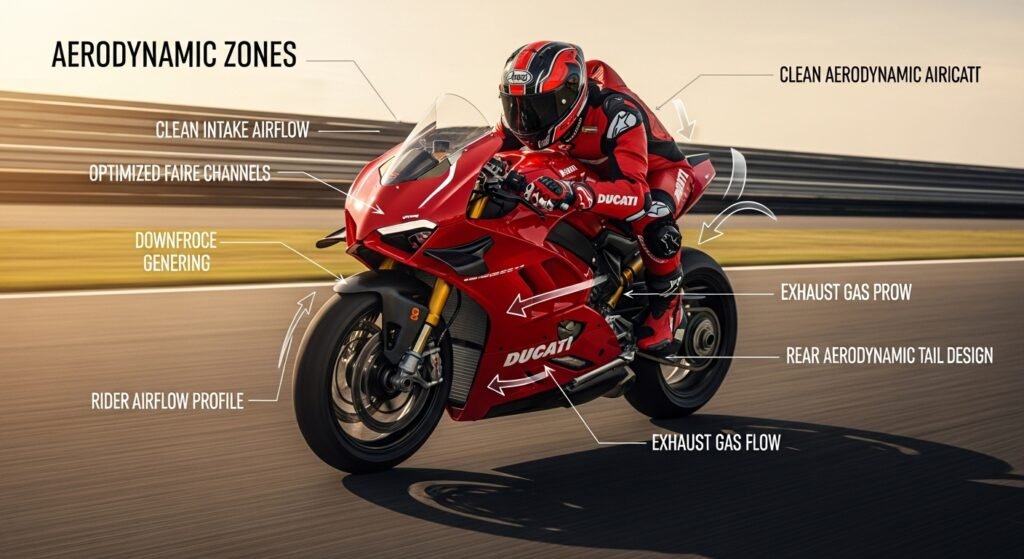 The redesigned fairing channels air efficiently around the chassis, cooling both the engine and the Brembo brakes. Ducati’s signature “Red Desire” livery exudes Italian flair while emphasizing the bike’s racing soul. The single-sided swingarm, exposed rear wheel, and aggressive stance transform the V4 R into a visual masterpiece — a symphony of aerodynamics and design precision.