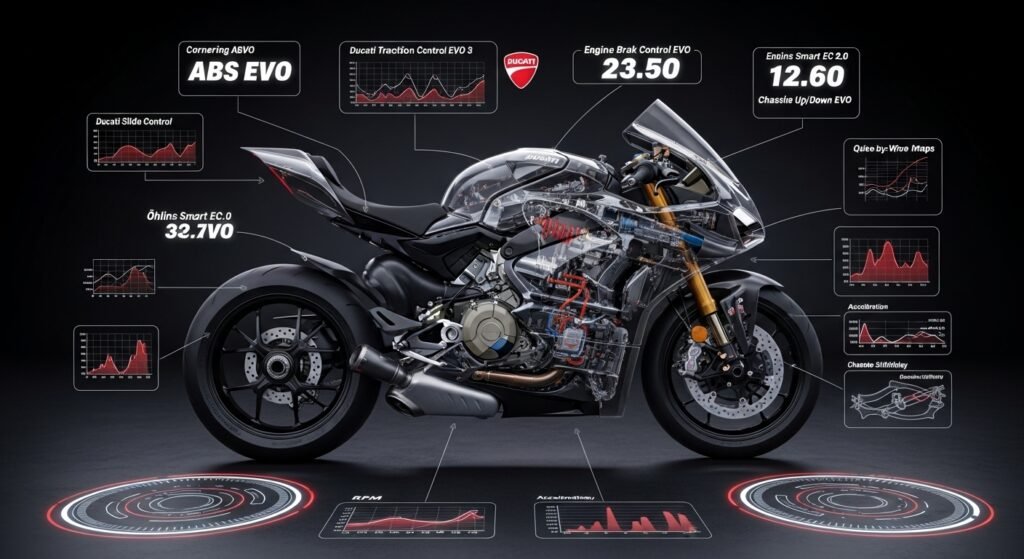 • Ducati Traction Control EVO 3 (DTC EVO 3) – Adapts power delivery based on lean angle and tire grip.