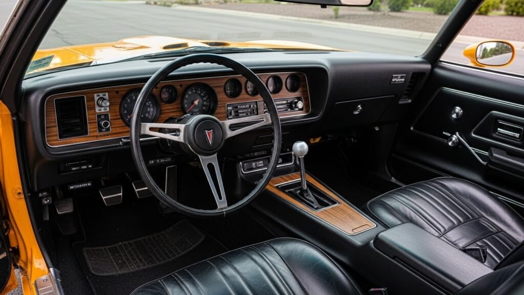 Step inside the Pontiac Firebird Trans Am 1973 and you’re instantly in a cockpit designed for performance. The wraparound dashboard with deep-set gauges and engine-turned aluminum trim, supportive bucket seats, and a driver-focused center console make it feel built for the road. Yet comfort wasn’t forgotten: air conditioning, upgraded audio, and power options made long drives enjoyable without losing the sporty, aggressive vibe that defines this classic muscle car.